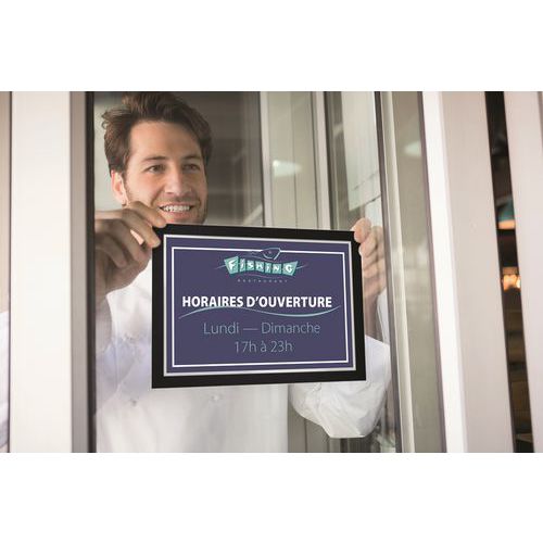 Marco para mostrar listas de precios, horarios de apertura, promociones, etc. Marco de presentación Duraframe® Sun, especialmente diseñado para superficies de cristal expuestas al sol. Gracias a su fijación vitrostática, el marco se puede fijar en escaparates, ventanas, vidrieras, etc. Inserción y actualización rápidas de la información gracias al marco magnético. Resistente al calor (hasta 70 °C), tiene una protección UV que dura hasta 2 años.
