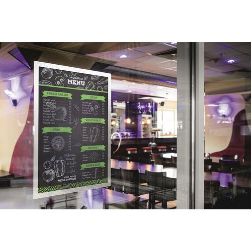Marco para mostrar listas de precios, horarios de apertura, promociones, etc. Marco de presentación Duraframe® Sun, especialmente diseñado para superficies de cristal expuestas al sol. Gracias a su fijación vitrostática, el marco se puede fijar en escaparates, ventanas, vidrieras, etc. Inserción y actualización rápidas de la información gracias al marco magnético. Resistente al calor (hasta 70 °C), tiene una protección UV que dura hasta 2 años.