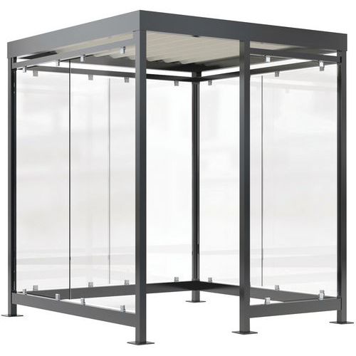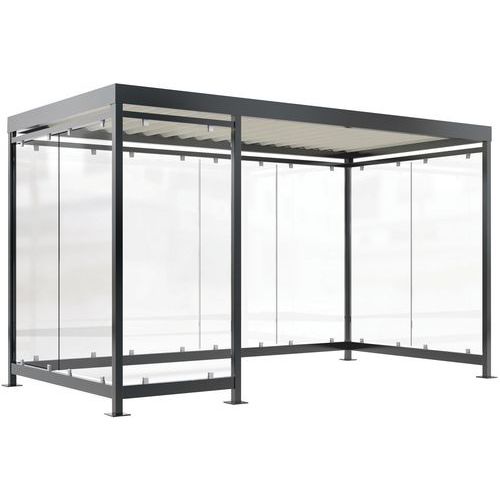 Marquesina para fumadores modulable y flexible de acuerdo a sus necesidades. Protección óptima contra la intemperie. Multiusos: marquesina para bicicletas, marquesina para fumadores o espacio de espera. Muy fácil de montar. Estructura robusta. Estética y moderna.