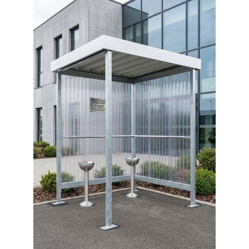 Marquesina para fumadores compacta y que ocupa poco sitio. Gran resistencia a la intemperie. Cómoda y agradable. Diseño depurado. Fabricado en la UE Montaje : Para montar Garantía al cliente : 2 años