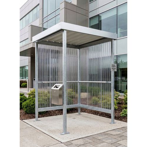 Marquesina para fumadores compacta y que ocupa poco sitio. Gran resistencia a la intemperie. Cómoda y agradable. Diseño depurado.
