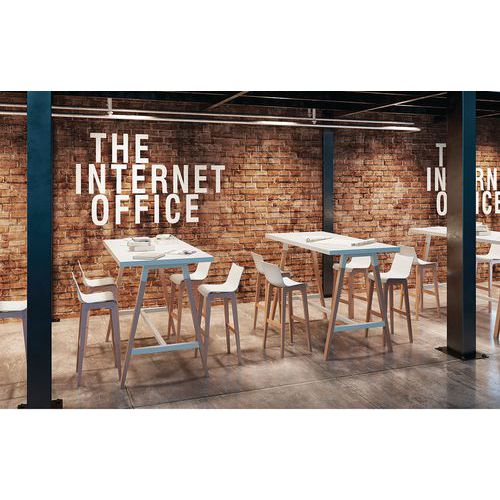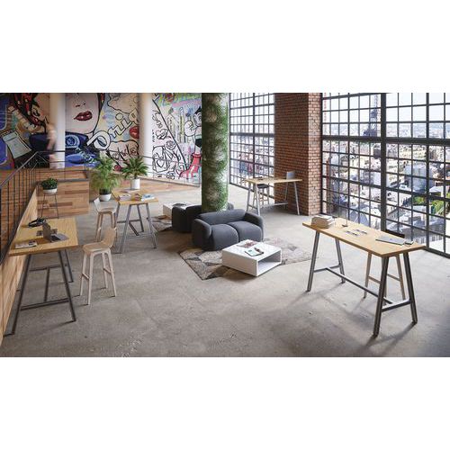 Las mesas altas Cohesion responden a los nuevos modos de trabajo de pie que invitan al intercambio y la colaboración. Los acabados naturales de los tableros asociados con las patas trapezoidales metálicas le dan un estilo industrial. Tableros con alma alveolar de 38 mm de grosor, con tratamiento antirreflejos y antiarañazos y propiedades antibacterianas. Patas en arco A de metal ensambladas por una viga estructural. Cantos de ABS resistentes a golpes de 2 mm.