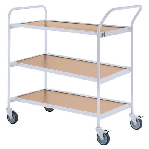 Mesa de estructura gris con ruedas, 3 bandejas, asa de dirección y arco tubular. Rebordes tubulares de 22 mm y bandejas de 12 mm de grosor. La carga máxima por bandeja es de 100 kg. Equipada con 4 ruedas pivotantes, 2 de ellas con frenos.