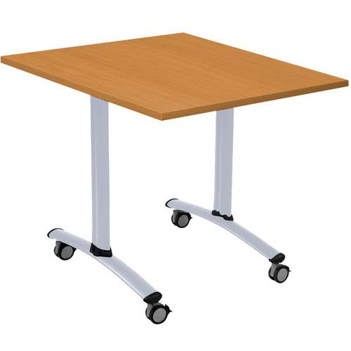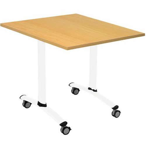 Mesa de reuniones cuadrada plegable con eje y tablero giratorio que ahorra espacio de almacenamiento. Bloqueo automático del tablero en posición de trabajo (horizontal) y vertical (almacenamiento). Sistema de conexión rápida entre los tableros mediante tornillo de mariposa. Provista de 4 ruedas de Ø 75 mm con freno. Mesa de reuniones cuadrada plegable con eje y tablero giratorio que ahorra espacio de almacenamiento. Bloqueo automático del tablero en posición de trabajo (horizontal) y vertical (almacenamiento). Sistema de conexión rápida entre los tableros mediante tornillo de mariposa. Provista de 4 ruedas de Ø 75 mm con freno. Cantos de ABS de 2 mm de grosor. Base de metal lacado con epoxi. Fabricada en Francia. Se suministra con las patas desmontadas.