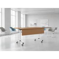 Mesa de reuniones cuadrada plegable con panel trasero eje y tablero giratorio que ahorra espacio de almacenamiento. Bloqueo automático del tablero en posición de trabajo (horizontal) y vertical (almacenamiento). Sistema de conexión rápida entre los tableros mediante tornillo de mariposa. Provista de 4 ruedas de Ø 75 mm con freno. Mesa de reuniones cuadrada plegable con panel trasero eje y tablero giratorio que ahorra espacio de almacenamiento. Bloqueo automático del tablero en posición de trabajo (horizontal) y vertical (almacenamiento). Sistema de conexión rápida entre los tableros mediante tornillo de mariposa. Provista de 4 ruedas de Ø 75 mm con freno. Panel trasero de 25 cm de altura. Cantos de ABS de 2 mm de grosor. Base de metal lacado con epoxi. Fabricado en Francia, se suministra con patas desmontadas.