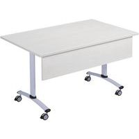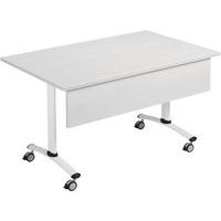 Mesa de reuniones rectangular plegable con panel trasero eje y tablero giratorio que ahorra espacio de almacenamiento. Bloqueo automático del tablero en posición de trabajo (horizontal) y vertical (almacenamiento). Sistema de conexión rápida entre los tableros mediante tornillo de mariposa. Provista de 4 ruedas de Ø 75 mm con freno. Mesa de reuniones rectangular plegable con panel trasero eje y tablero giratorio que ahorra espacio de almacenamiento. Bloqueo automático del tablero en posición de trabajo (horizontal) y vertical (almacenamiento). Sistema de conexión rápida entre los tableros mediante tornillo de mariposa. Provista de 4 ruedas de Ø 75 mm con freno. Panel trasero de 25 cm de altura. Cantos de ABS de 2 mm de grosor. Base de metal lacado con epoxi. Fabricada en Francia. Se suministra con las patas desmontadas.