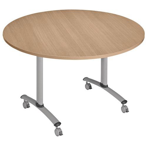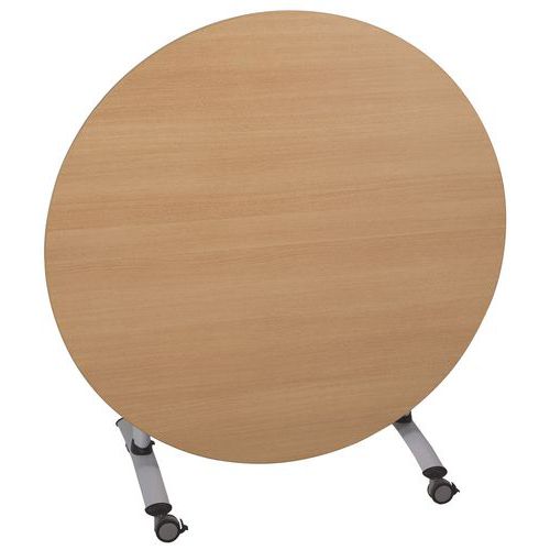 Mesa de reuniones redonda plegable con eje y tablero giratorio que ahorra espacio de almacenamiento. Bloqueo automático del tablero en posición de trabajo (horizontal) y vertical (almacenamiento). Sistema de conexión rápida entre los tableros mediante tornillo de mariposa. Provista de 4 ruedas de Ø 75 mm con freno. Mesa de reuniones redonda plegable con eje y tablero giratorio que ahorra espacio de almacenamiento. Bloqueo automático del tablero en posición de trabajo (horizontal) y vertical (almacenamiento). Sistema de conexión rápida entre los tableros mediante tornillo de mariposa. Provista de 4 ruedas de Ø 75 mm con freno.