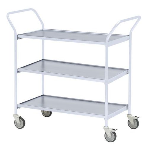 Mesa de acabado gris con ruedas, 3 bandejas y 2 asas de dirección.