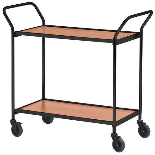Mesa de acabado negro con ruedas, 2 bandejas y 2 asas de dirección.