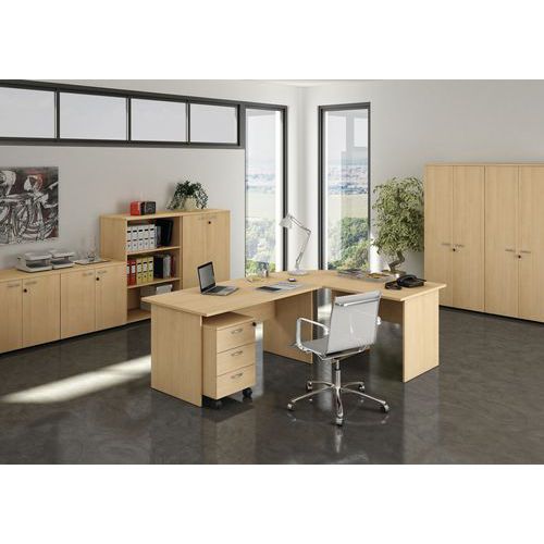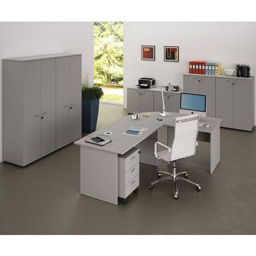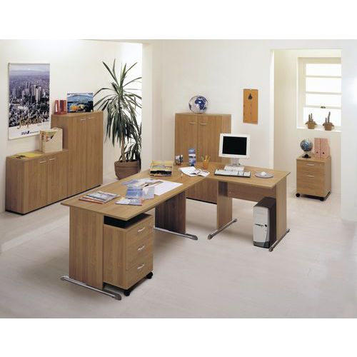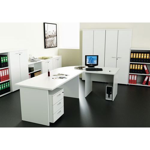 Mesa de oficina compacta con 2 posibilidades de distribución. Cantos de PVC antigolpes (esp. 3 mm). Tablero ergonómico, adaptado al trabajo con ordenador.