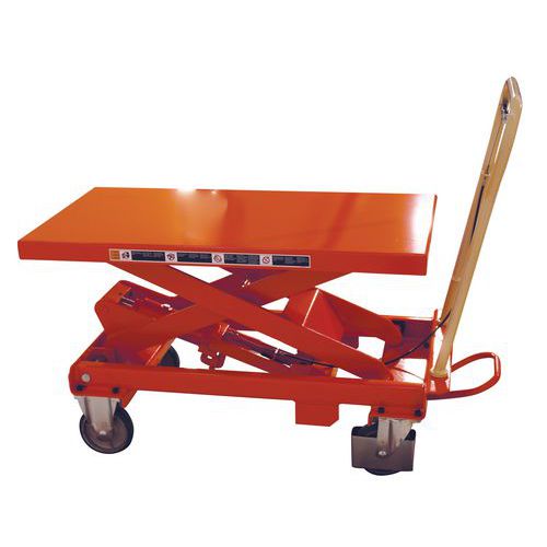 - Mesa elevadora manejable, equipada con ruedas de baja resistencia al arranque.