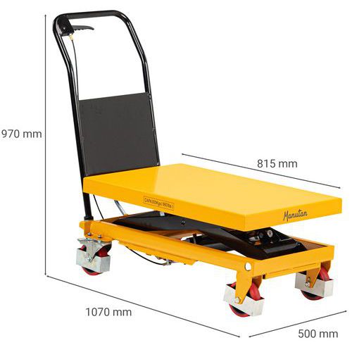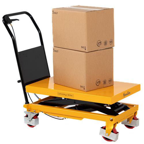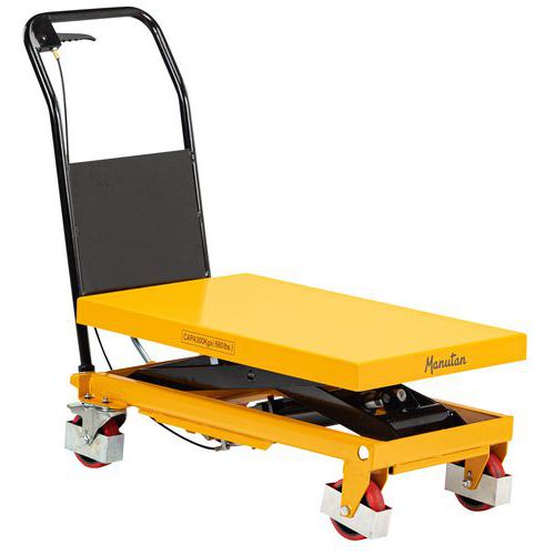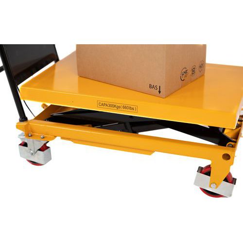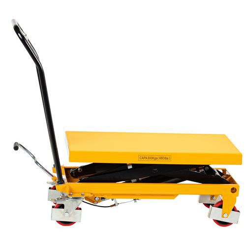 | Nombre del producto | Mesa elevadora móvil, Carga: 300 kg, Plataforma altura máx.: 895 mm, Nº impulsos de pedal para alt. máx: 38 |