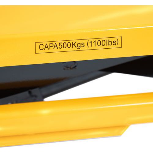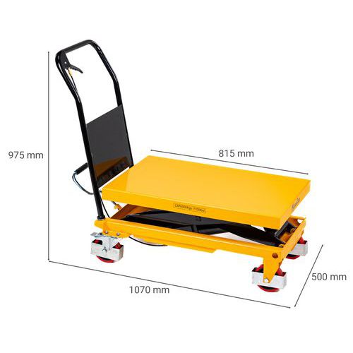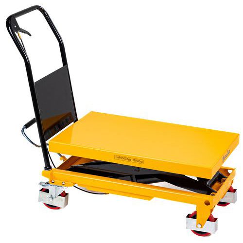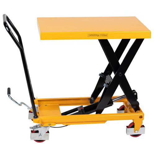 | Nombre del producto | Mesa elevadora móvil, Carga: 500 kg, Plataforma altura máx.: 895 mm, Nº impulsos de pedal para alt. máx: 50 |