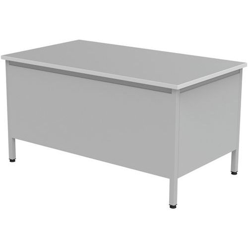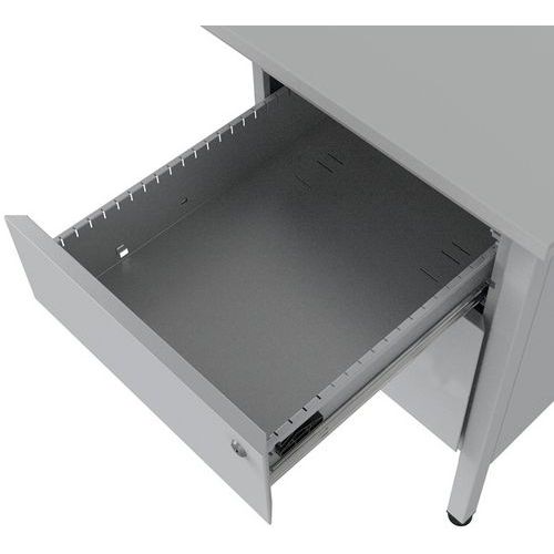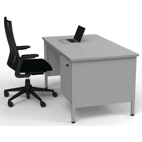 Mesa robusta e intemporal. Tablero antirreflejos de alta resistencia (esp. de 25 mm). Cajón con cerradura central. El cajón puede instalarse tanto a la derecha como a la izquierda. Patas con pies regulables. Marco autoportante y panel de fondo metálico.