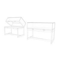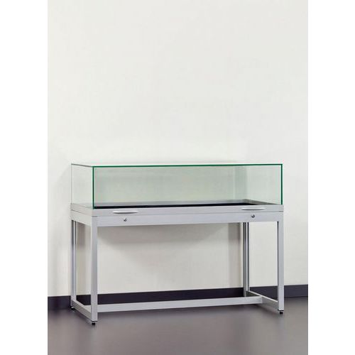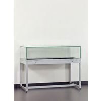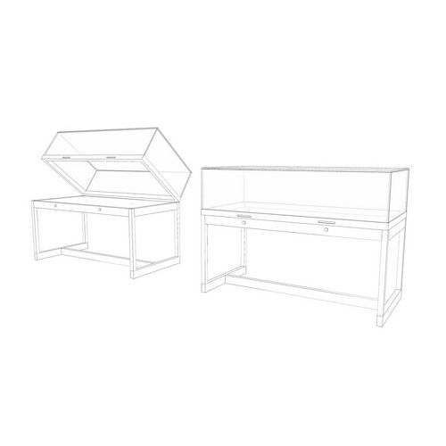 Mesa vitrina con patas, lista para su uso de inmediato. Campana en vidrio templado de alta calidad de 8 mm de espesor. Estructura de la base robusta y resistente. Apertura mediante amortiguadores de gas invisibles. 2 cerraduras de seguridad y asas de agarre.