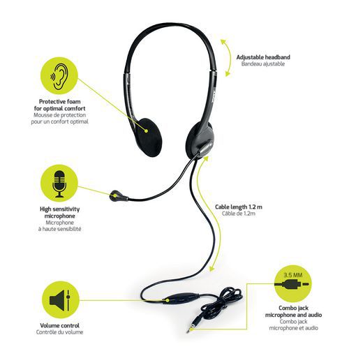 | Nombre del producto | Microauriculares con cable, Selección teletrabajo: sí, Duración utilización aconsejada: 5 h, Conexión: Jack |