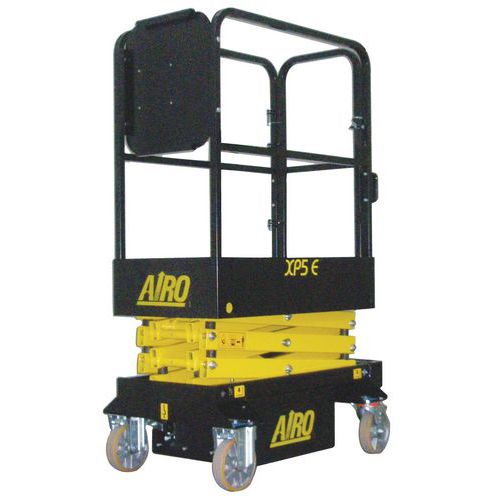 Equipada con: - un detector de inclinación, - un botón de parada de emergencia, - un botón de descenso de urgencia, - una alarma sonora de peligro por inestabilidad, - un stop anticizallado en bajada, - un dispositivo de protección de batería, - una caja para almacenamiento de documentos.