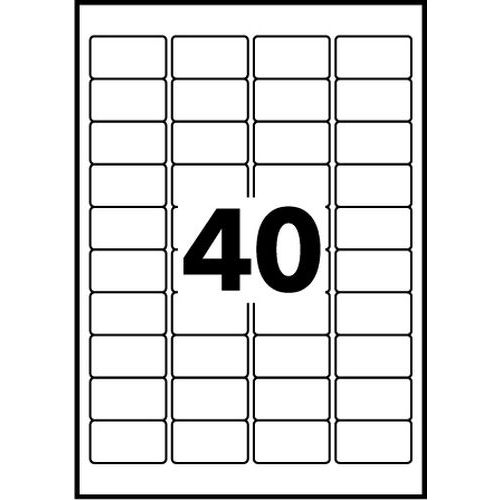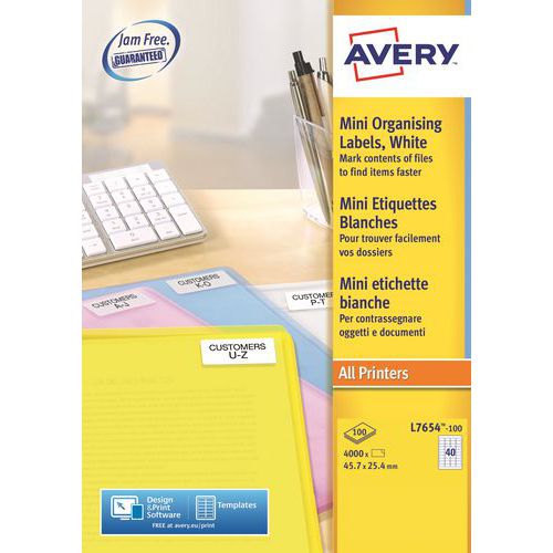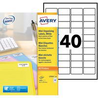 Minietiqueta Avery, N.º de etiquetas/plancha: 40, Nº de etiquetas: 4000, Longitud Etiqueta: 45.7 mm Minietiqueta Avery, N.º de etiquetas/plancha: 40, Nº de etiquetas: 4000, Longitud Etiqueta: 45.7 mm