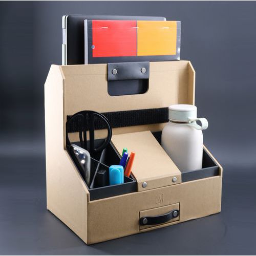 Organizador de escritorio portátil con un aspecto natural y cubierto de papel.