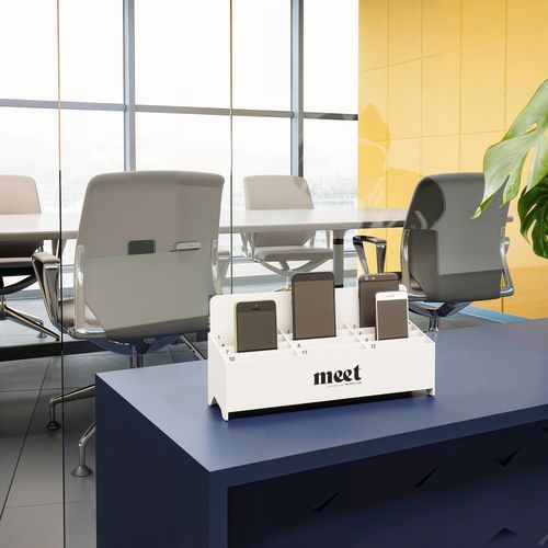 | Nombre del producto | Organizador para teléfonos con 12 compartimentos, Material: Poliestireno de alto impacto, Color: Gris |