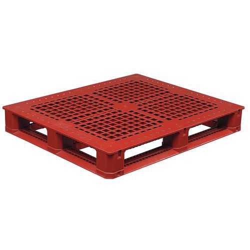 Palé plástico de dimensiones estándar para el transporte, el almacenamiento y la manutención. Grandes aperturas para el paso fácil de las horquillas de los aparatos de mantenimiento. Material conforme a la norma de productos alimentarios: no se produce reacción a la humedad ni a las bacterias. Con borde antideslizamiento para que la carga permanezca en su posición sobre el palé. Palé apilable con patas para un aumento de volumen del 62% en la carga de vuelta.