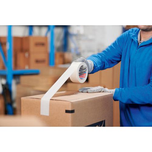 Adhesivo para embalaje multiuso compuesto de un soporte de papel finamente crepado y una masa adhesiva. El adhesivo está hecho de caucho natural. Adecuado para embalaje ligero.