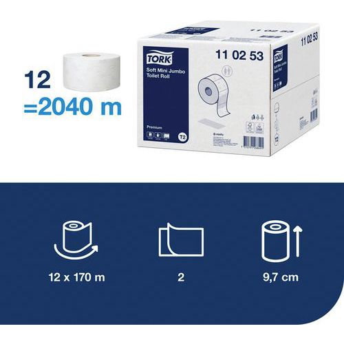 Papel higiénico Mini y Maxi Jumbo Tork Premium, Nº de pliegues: 2, Longitud Rodillo: 1700 cm, Color: Blanco Papel higiénico Mini y Maxi Jumbo Tork Premium, Nº de pliegues: 2, Longitud Rodillo: 1700 cm, Color: Blanco