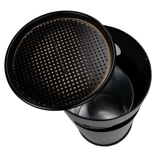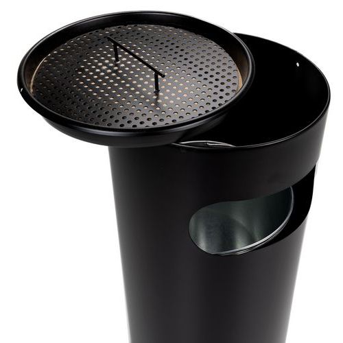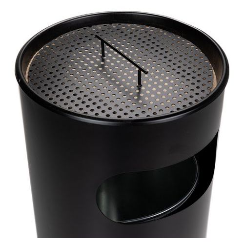 Papelera-cenicero ignífuga redonda con cubeta de metal.