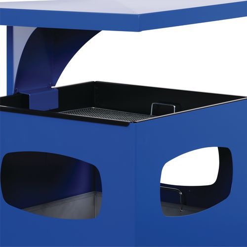 Papelera con cenicero y accesorio para la arena de chapa de acero galvanizado. Revestimiento de epoxi negro, rejilla para colillas galvanizada y bastidor galvanizado. Cubo interior de chapa de acero galvanizado con asas. Revestimiento anticorrosión de pintura epoxi polimerizada resistente a los rayos UV y al orín. Protección antirrobo de la bandeja superior mediante cerradura con llavín. Ideal para exteriores
