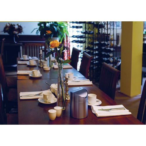 | Nombre del producto | Papelera de mesa- 1.5 L, Capacidad: 1.5 L, Abertura: Con pedal, Material: Metal, Material: Acero inoxidable |