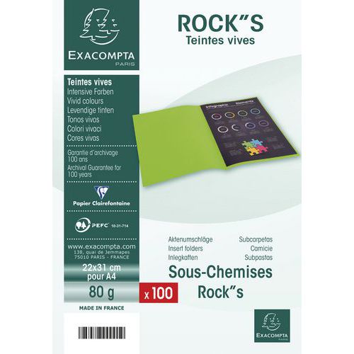 Paquete de 100 subfundas ROCK''S 80 - 22x31 cm Rock''s Fundas de colores vivos y luminosos. Con Rock''s, sus fundas se distinguirán y le resultará más sencillo encontrar los documentos, organizados por colores. Las subfundas sirven para separar en más secciones los documentos guardados en una funda. Al igual que los separadores, los colores permitan identificar fácilmente las diferentes secciones. El papel de 80g/m2 es resistente y de calidad. El papel se fabrica localmente en las fábricas del grupo Exacompta-Clairefontaine.