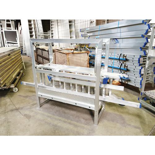 Resistente pasarela de aluminio para trabajar en altura con total seguridad. Ultraestable gracias a dos estabilizadores regulables provistos de patas pivotantes. Espacio reducido gracias a la parte de escalera desmontable (barandilla fija).