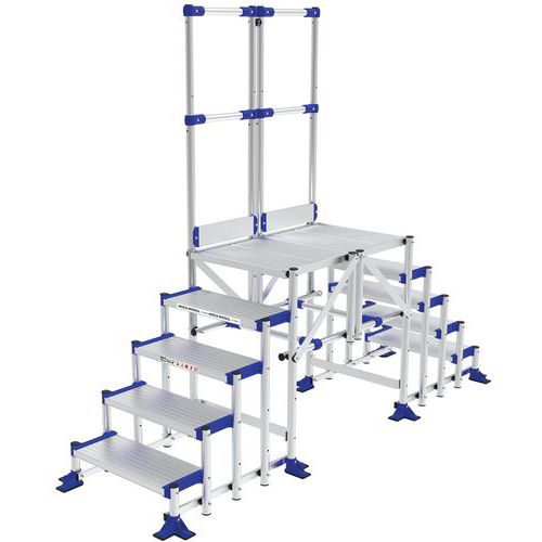 Pasarela de aluminio fija de doble acceso, altura de acceso baja. Segura: 1 barandilla integrada para mayor seguridad anticaídas. Estable con plataforma ancha y peldaños amplios antideslizantes. Pasarela fijable en el suelo si es necesario con patas grandes de doble fijación. Estructura muy resistente, adaptada para uso intensivo, se requieren suelos planos. Cómoda, ampliable, polivalente, adaptable a todos los tipos de necesidades. pata de doble fijación, tornillo de Ø 8 mm (no incluido). Barandilla con zócalo integrado (al. 100 mm).