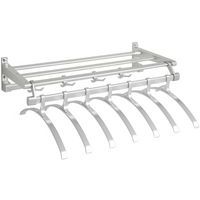 Percha mural de aluminio anodizado con bonito acabado y con colgadores. Materiales de estructura, barra y colgadores duraderos y resistentes. Bandeja de almacenamiento de nivel superior fabricada con listones. 1 barra trasera con colgadores, 1 barra delantera con portaperchas.