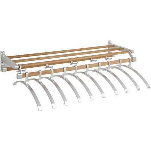 Percha mural de aluminio anodizado con bonito acabado y con colgadores. Materiales de estructura, barra y colgadores duraderos y resistentes. Bandeja de almacenamiento de nivel superior fabricada con listones. 1 barra trasera con colgadores, 1 barra delantera con portaperchas.