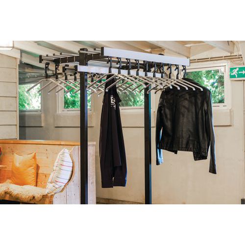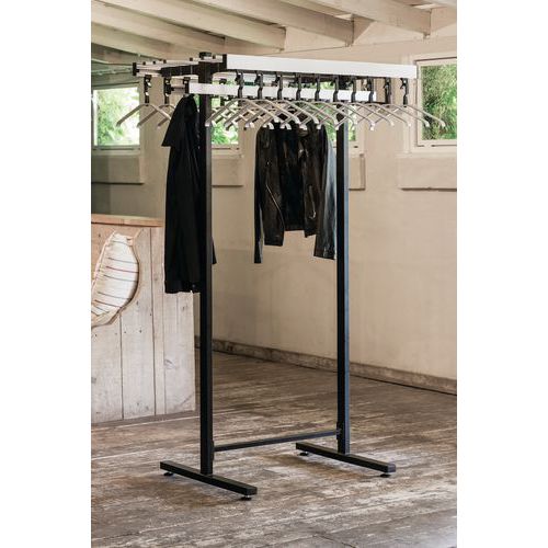 | Nombre del producto | Perchero, Altura: 175 cm, Ancho: 120 cm, Color: Negro, Tipo de producto: Doble, Profundidad: 110 cm |