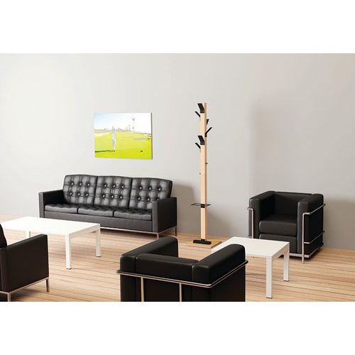 Perchero perfectamente estable con base ancha y cuadrada de madera contrachapada.