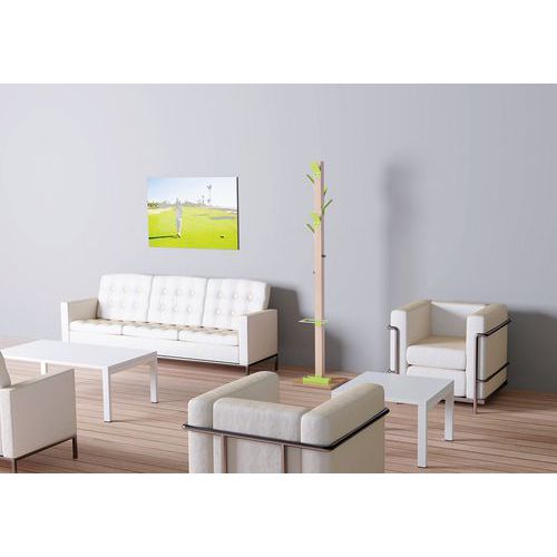 Columna de haya maciza barnizada, paragüero, ganchos y cubeta de color.