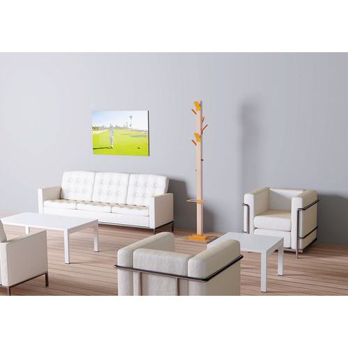 6 perchas de poliestireno antigolpes de alta resistencia para ropa. 2 perchas para accesorios de acero cromado. Columna de haya maciza de 60 x 60 mm. Base con pie contrachapado de 35 x 35 cm, espesor de 20 mm.