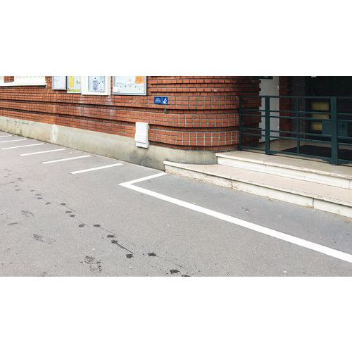 Trazado preciso de líneas sobre suelos de aparcamientos, almacenes y zonas de almacenamiento. Trazado de 75 a 100 m con 50 mm de ancho sobre suelo regular. Excelente poder de recubrimiento. Alta resistencia a la abrasión mecánica y química. Secado rápido. Pintura epoxi de marcado sin aditivos a base de plomo, CFC ni disolventes clorados. Gran duración. Es recomendable para llevar a cabo el distanciamiento social. Permite el mantenimiento de al menos un metro de distancia.