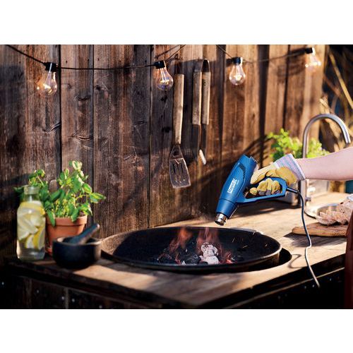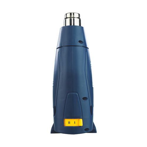 La pistola de aire caliente cuenta con 2 ajustes del caudal de aire, protección de la empuñadura, base estable para garantizar el trabajo en posición vertical con ambas manos libres y un maletín que incluye 2 espátulas y 4 boquillas.