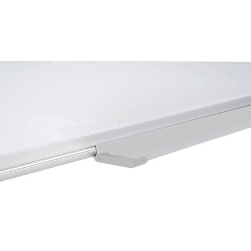Pizarra blanca esmaltada con marco de aluminio resistente y elegante. Práctica para sus presentaciones gracias a su superficie magnética. Adaptada para un uso intensivo. Garantía contra las rayaduras y las marcas. Dotada de un anaquel portaaccesorios para mantener sus rotuladores al alcance de la mano. Montaje en pared simple y rápido (fijaciones suministradas). 4 orificios traseros en las 4 esquinas (3,5 mm de diámetro). Orificios de fijación ocultos mediante tapas de plástico para tornillos.