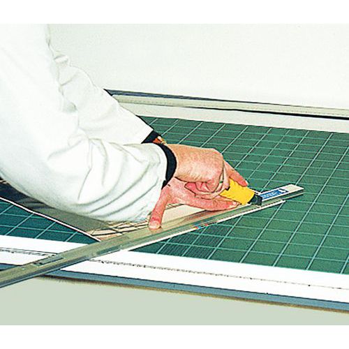 - Esta placa de corte autocicatrizante protege su superficie de trabajo y alarga la vida útil de sus cuchillas.