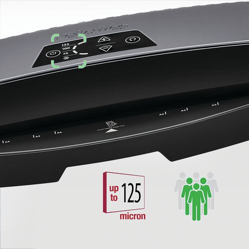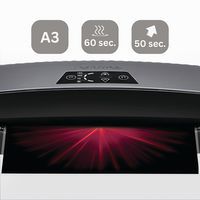 Lista para plastificar en 60 segundos gracias a la tecnología InstaHeat. Plastifica documentos hasta formato A3 de 80 a 125 micras. Velocidad máxima de plastificación de 50 segundos para una funda de 80 micras. Sistema de retroceso automático que permite realinear la funda en caso de inserción incorrecta o atasco. Modo en espera automático después de 30 minutos de inactividad.