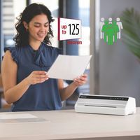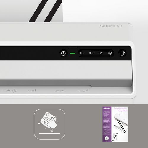 Plastificadora Saturn, lista para plastificar en 60 segundos gracias a la tecnología InstaHeat. Plastifica documentos de 80/100/125 micras y en formatos A4 y A3. La palanca de liberación de documentos permite volver a insertar o alinear los documentos. Sistema de alerta de limpieza para obtener siempre resultados de alta calidad y una plastificación óptima. Modo en espera automático después de 30 minutos de inactividad. Velocidad máxima de plastificación de 50 cm/minuto.