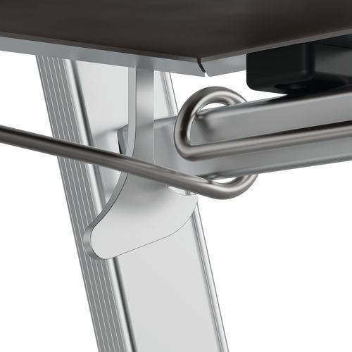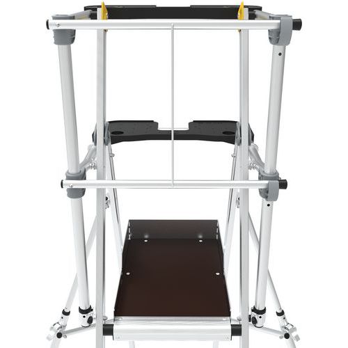 Plataforma ajustable Sherpascopic. Barandilla rígida en los 4 lados con largueros de protección anticaídas y cierre semiautomático. Peldaños antideslizantes de 80 mm. Compartimento portaherramientas extraíble, con resistencia hasta 25 kg y ganchos integrados (máx. 10 kg). Estante XL con resistencia hasta 25 kg. Plataforma antideslizante de alto confort de 590 x 400 mm de madera de origen ecológico. Espacio de trabajo ergonómico y cómodo. Estabilizadores retráctiles con ajuste milimétrico. Superficies telescópicas que permiten el cambio de nivel. Sistema de ajuste de la altura intuitivo y seguro con ajuste cada 23 cm (por peldaño). La plataforma se cuenta como un peldaño.