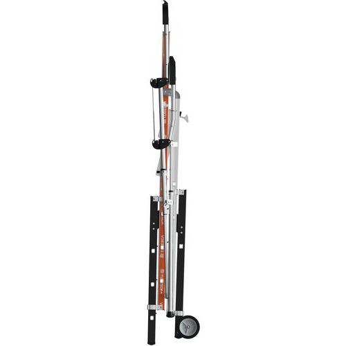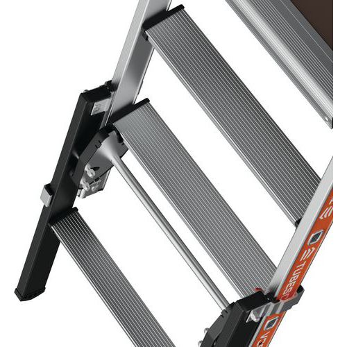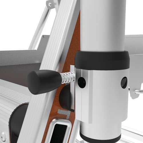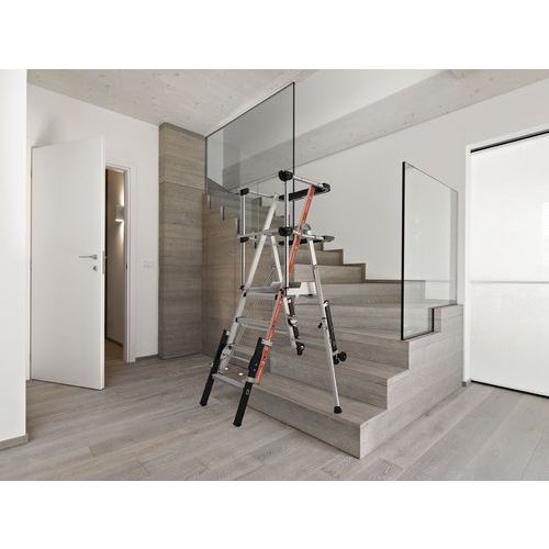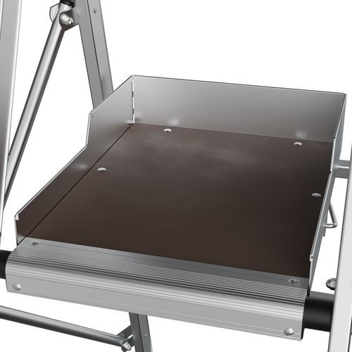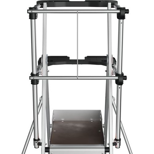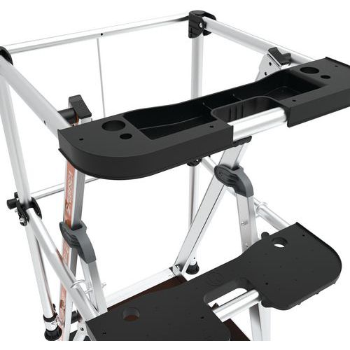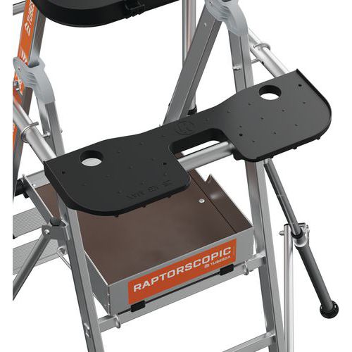 Plataforma con doble baranda Raptorscopic. Barandilla rígida en los 4 lados con largueros de protección anticaídas y cierre semiautomático. Peldaños antideslizantes de 80 mm (superficie fija) y 60 mm (superficie telescópica). Compartimento portaherramientas con resistencia hasta 25 kg y ganchos integrados (máx. 10 kg). Estante XL con resistencia hasta 25 kg. Superficies telescópicas que permiten el cambio de nivel. Sistema de ajuste de altura intuitivo y seguro con ajuste cada 23 cm. Suelo antideslizante de madera de origen ecológico de 500 x 400 mm. Espacio de trabajo ergonómico. Estabilizadores retráctiles con ajuste milimétrico.