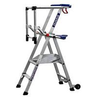 Plataforma individual fija autoportante de aluminio de nueva generación. Instalación rápida y sencilla gracias a la colocación de las barandillas con un solo movimiento. Alta seguridad con protección trasera mediante barandillas articuladas y enganche automático. Plataforma cómoda y eficaz con 2 estantes en serie con compartimentos. Peldaños de 80 mm de ancho para mayor comodidad.