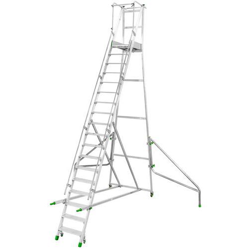 Plataforma móvil ergonómica fácil de mover gracias a los mangos plegables. Ángulo de subida de 60° para un uso fácil y protegido. Comodidad y seguridad con plataforma de chapa de diamante. Peldaños grandes y amplios, antideslizantes. Plataforma con portaherramientas desmontable. Escalera plegable fácil de guardar. Fabricado en la UE Garantía al cliente : 5 años Carga máx. (kg) : 150 kg
