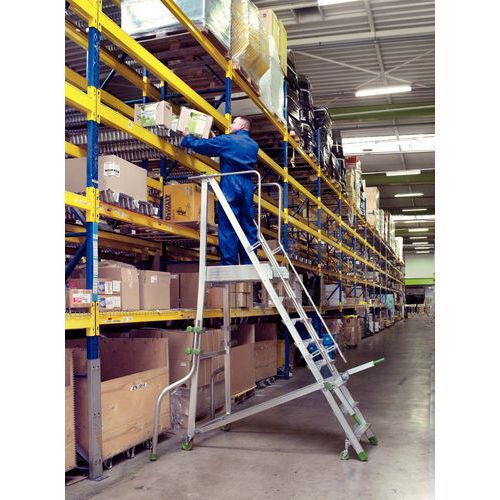 Plataforma móvil ergonómica fácil de mover gracias a los mangos plegables. Ángulo de subida de 60° para un uso fácil y protegido. Comodidad y seguridad con plataforma de chapa de diamante. Peldaños grandes y amplios, antideslizantes. Plataforma con portaherramientas desmontable. Escalera plegable fácil de guardar. La barra de seguridad de la barandilla se acciona mediante una palanca y se abre verticalmente. Fabricado en la UE Carga máx. (kg) : 150 Garantía al cliente : 5 años
